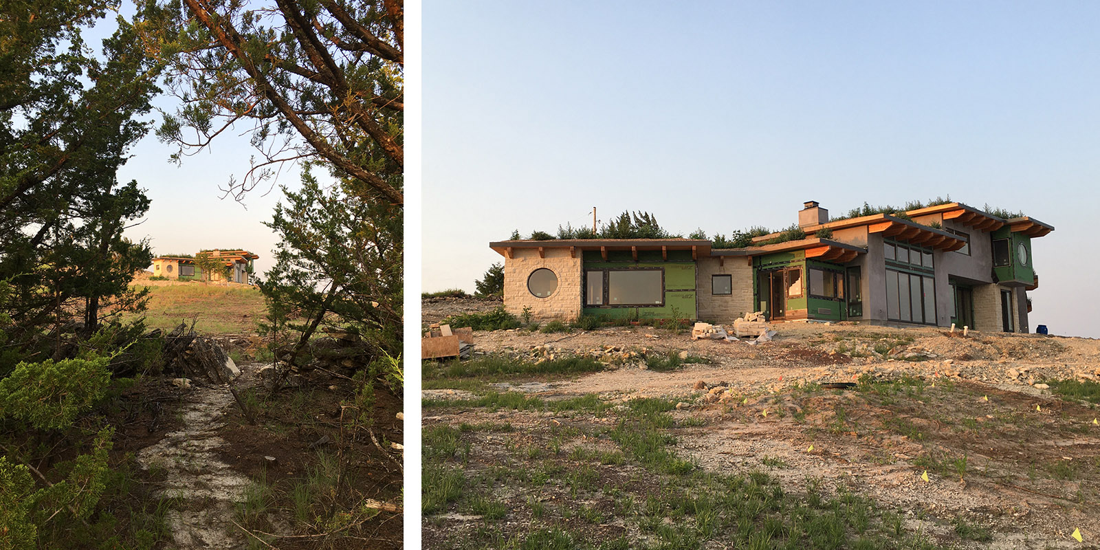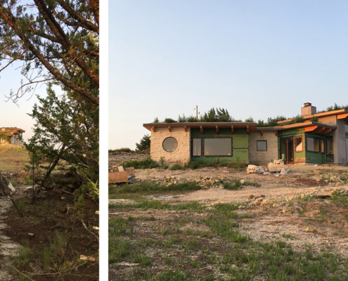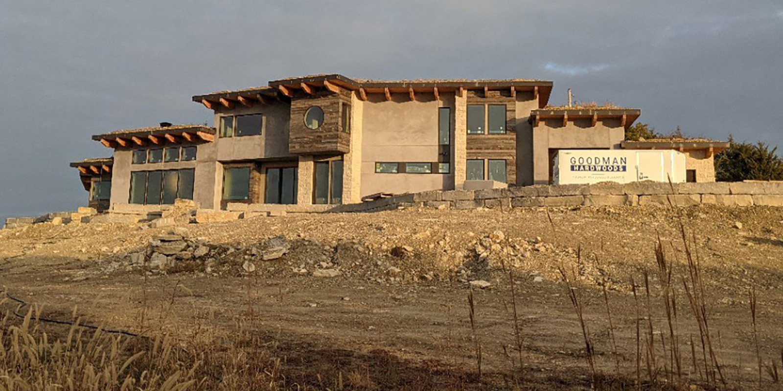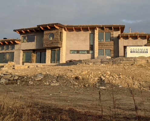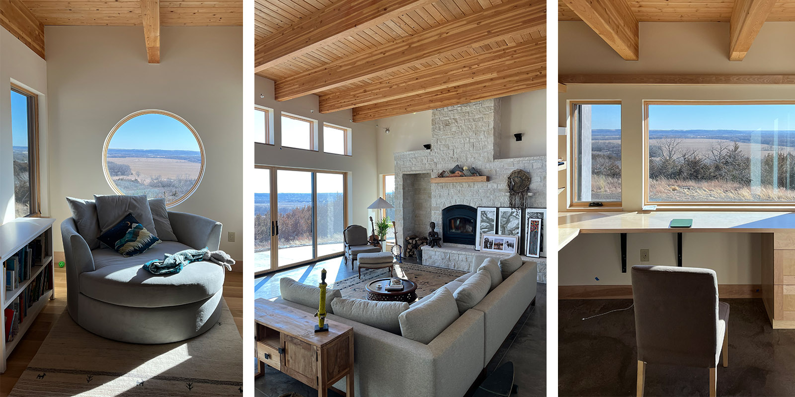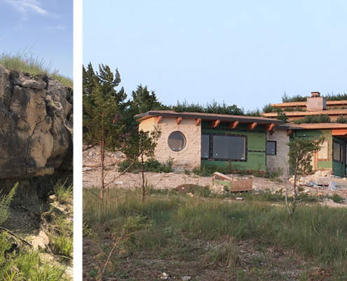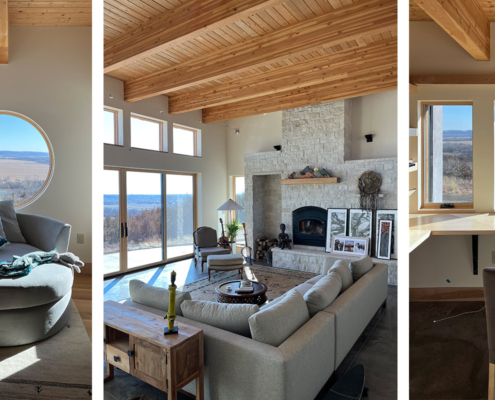 This home design is strongly influenced by the Owners’ deep environmental values and a site that looks over the city of Manhattan, Kansas in the Flint Hills. The time tested approach in tornado country of earth integration led to placing the home in the sloping hillside meadow and literally extending the meadow over the roof in the form of sod. The use of high insulation, thermal mass, and high performance windows are all aspects of passive design. The material palette includes recycled snow fence siding, stucco, and local limestone.